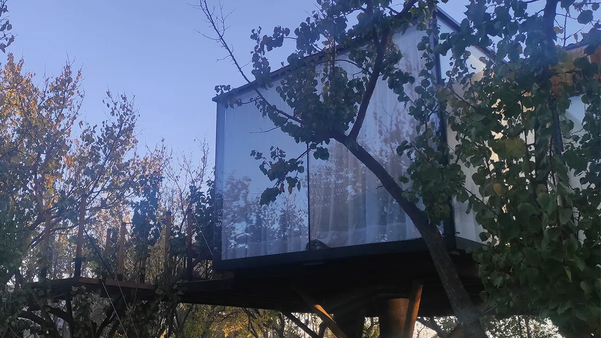 Hanami representa ejemplares inexistentes, cabañas suspendidas entre las copas de los árboles a través de una pasarela suspendida, delicada apoyada en los cortes de la poda. Esta pasarela guía a los huéspedes hacia las diferentes cabañas, permitiéndoles ser testigos del ciclo de las estaciones, desde las flores primaverales y el verdor del verano, pasando por los ocres del otoño hasta la desnudez del invierno. Un ciclo que se repite cada año, recordando la eterna renovación de la naturaleza.